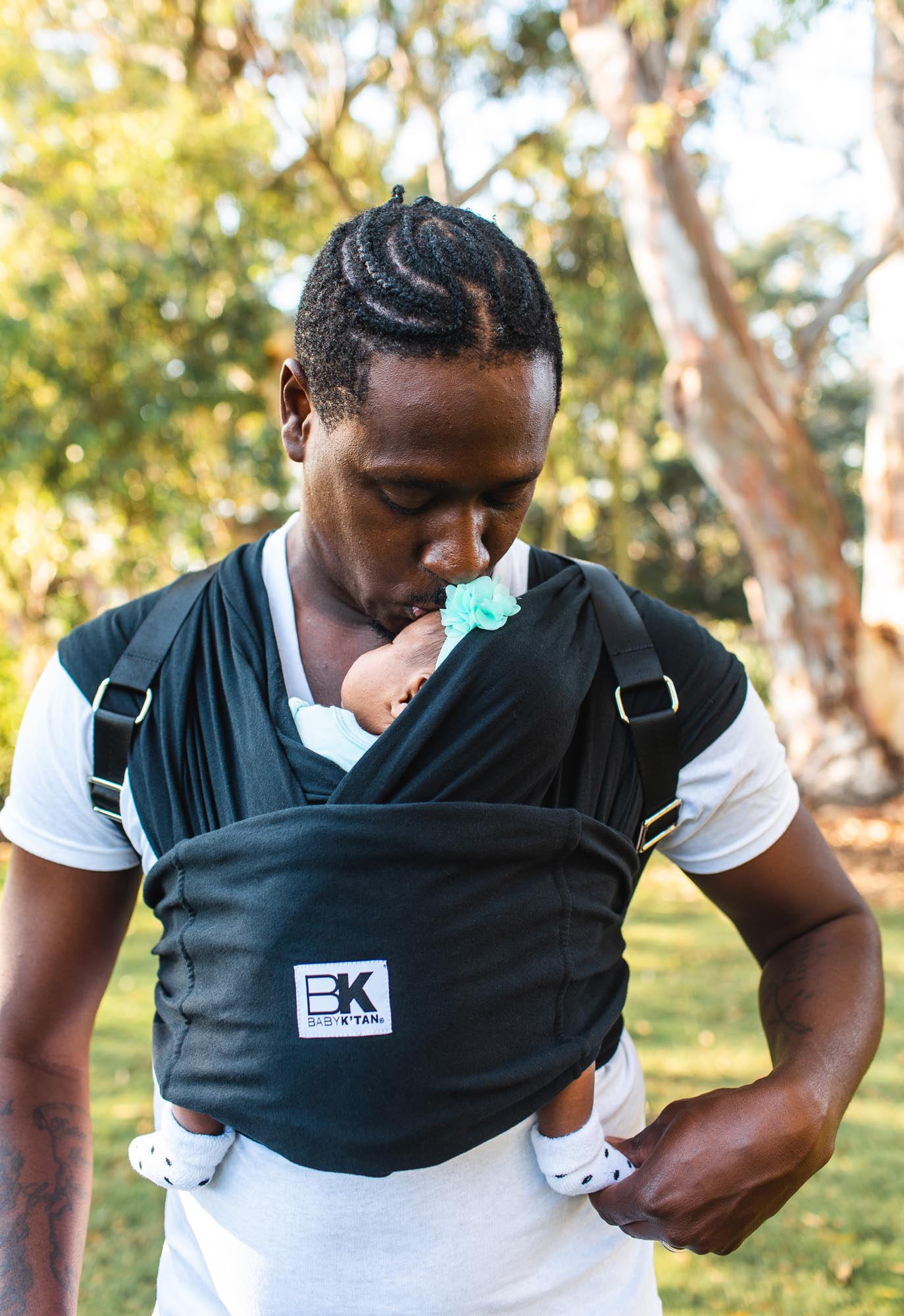 A woman affectionately kisses a baby wrapped in a pink carrier against her chest. They stand outdoors with trees in the background, conveying warmth and love.
