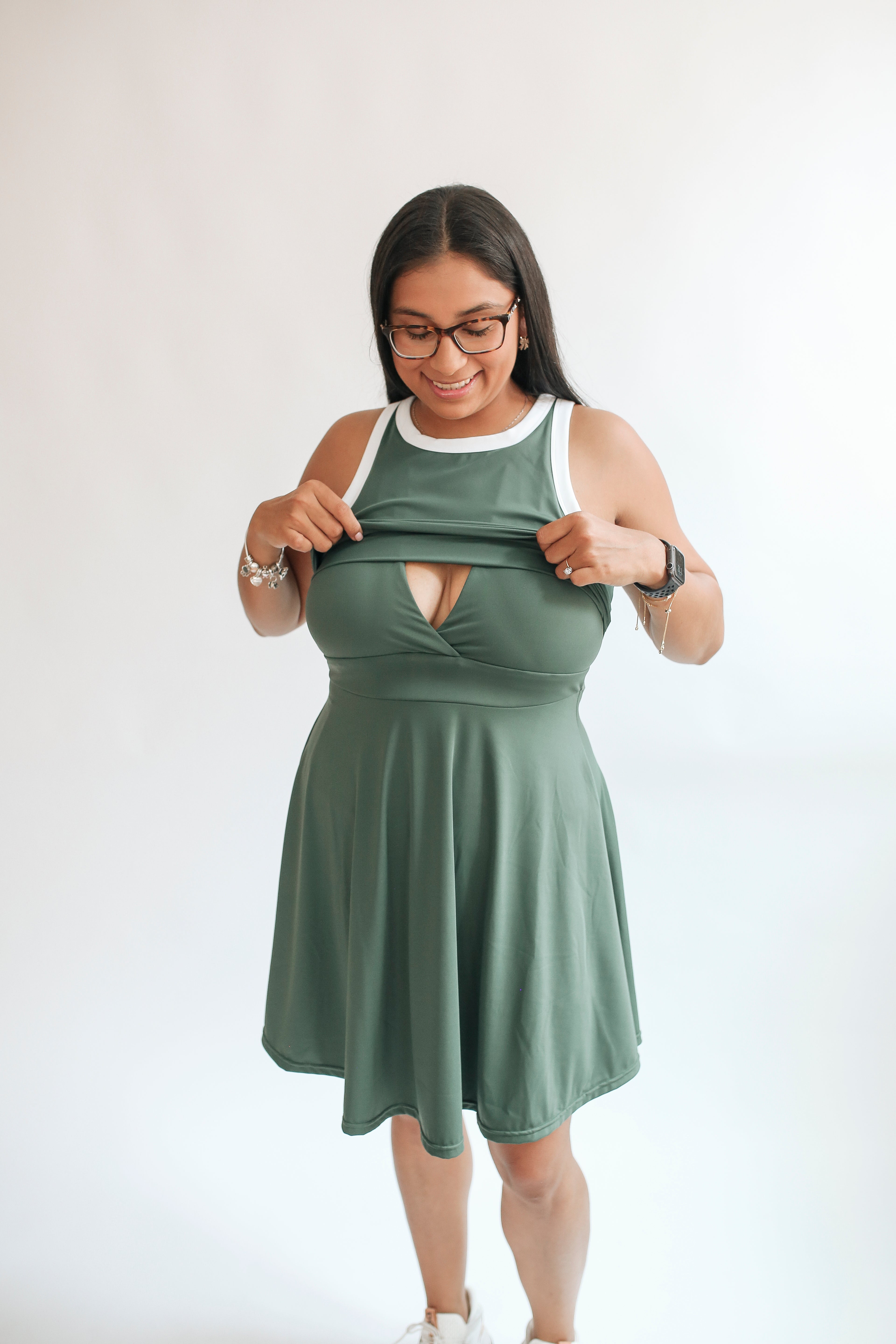 The Courtside Nursing Tennis Dress is made for active motherhood, blending function, comfort, and style. Designed with a high neckline, flattering A-line waist, and breezy, flowy fit, this dress looks as good as it feels—whether you're chasing toddlers, running errands, or squeezing in a quick workout.